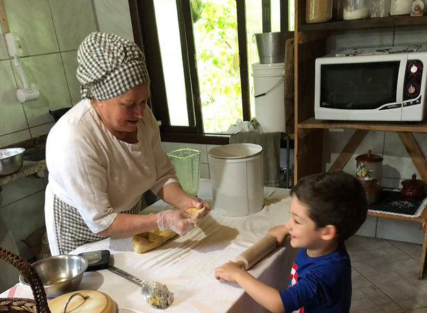 Dona Luzia fica sempre numa mesa próxima ao fogão, batendo ovos, sovando massa de pão... Tá sempre com as mãos esbranquiçadas de farinha.