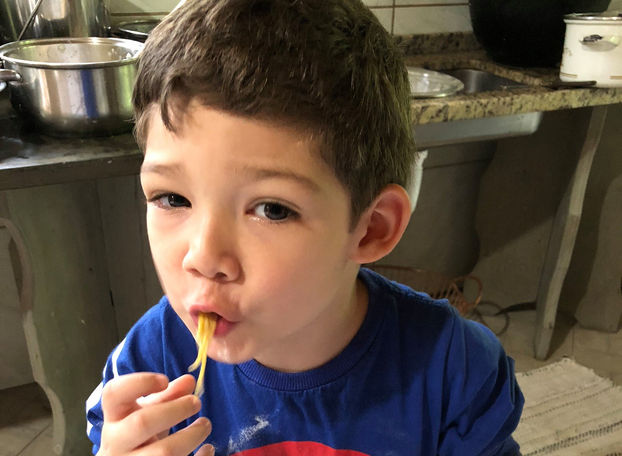 E tem o momento em que as crianças podem participar. Pedro ganhou pau de macarrão e esticou massa. Sujou as mãos e o rosto com farinha (a roupa tbm!). Viu os ingredientes se transformarem no próprio alimento. Fez massa de pizza.